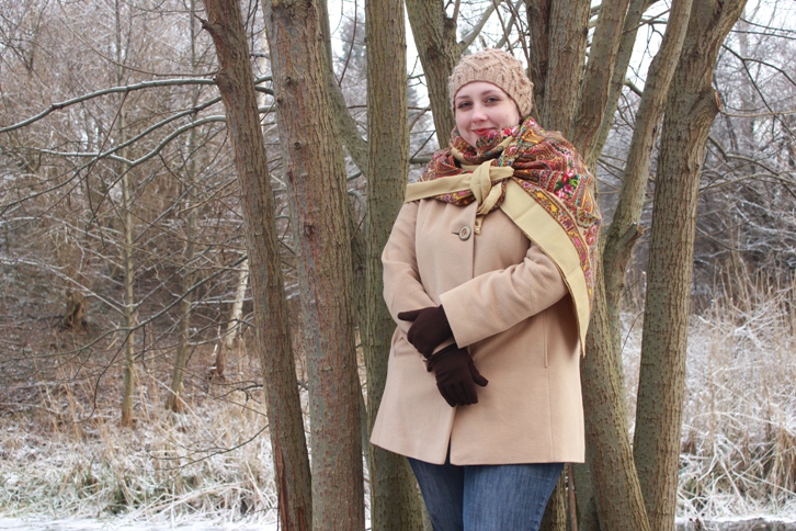 Меня Юлия совершенно очаровала на Натали, но я предполагала, что на мне она так золотом гореть не будет. Бежевый цвет высветлил шаль, чего я и добивалась (когда я показывала ее первый раз, коричневая куртка вытянула все коричневатые места в орнаменте - я и не ожидала что так получится, в таком виде шаль для меня несколько скучной показалась, красивой, но не совсем моей, а сегодняшний вариант мне подошел)