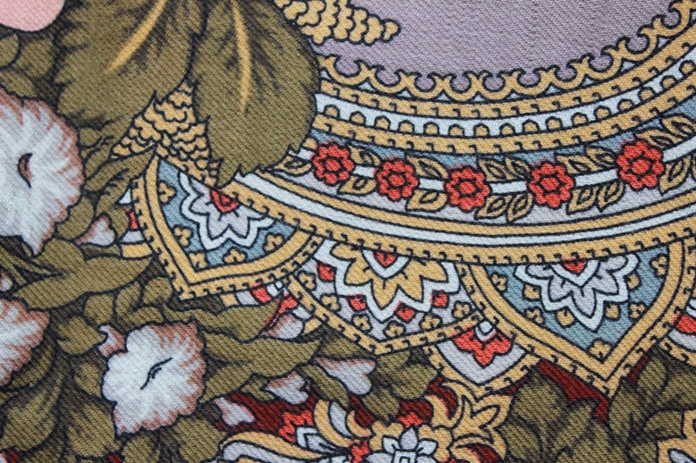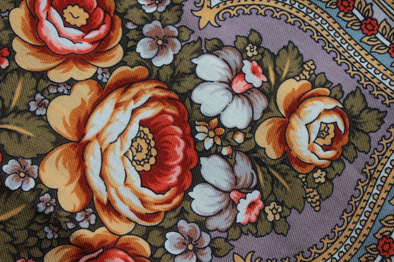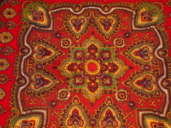 Носила его "в хвост и в гриву" пока училась в институте, сейчас часто не надеваю- очередь до него редко доходит из-за платочного изобилия. Но на пенсию еще не отправлен, хотя сильно ношен, покусан молью и многократно стирался. Краски остаются яркими и чистыми.