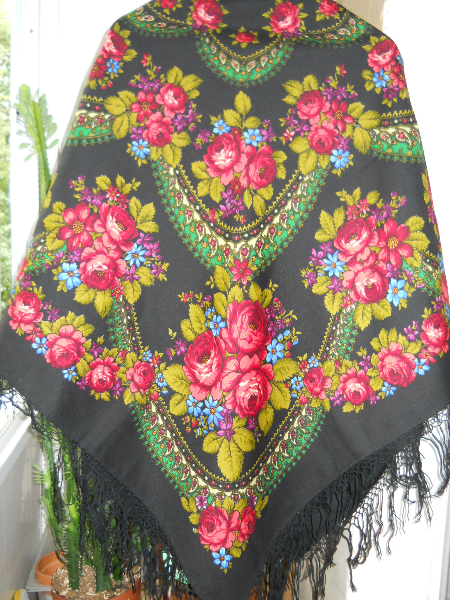 А синий мне нравится. Нравится за такой необычный синий оттенок, и не важно уже какие маки, они и на маки то не похожи, важно, что они красивого розоватого цвета. И представляется мне этот платок с бахромой под цвет маков, что-нибудь эдакое, можно бисера немножко понасажать, бахрому можно неровную сделать.