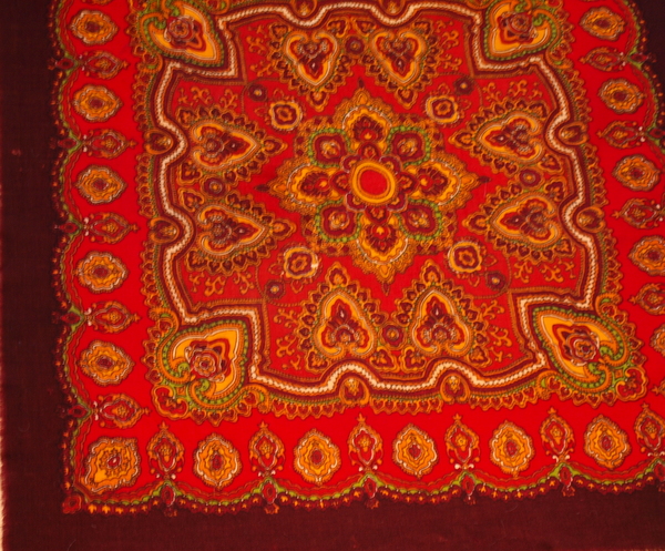 Носила его "в хвост и в гриву" пока училась в институте, сейчас часто не надеваю- очередь до него редко доходит из-за платочного изобилия. Но на пенсию еще не отправлен, хотя сильно ношен, покусан молью и многократно стирался. Краски остаются яркими и чистыми.