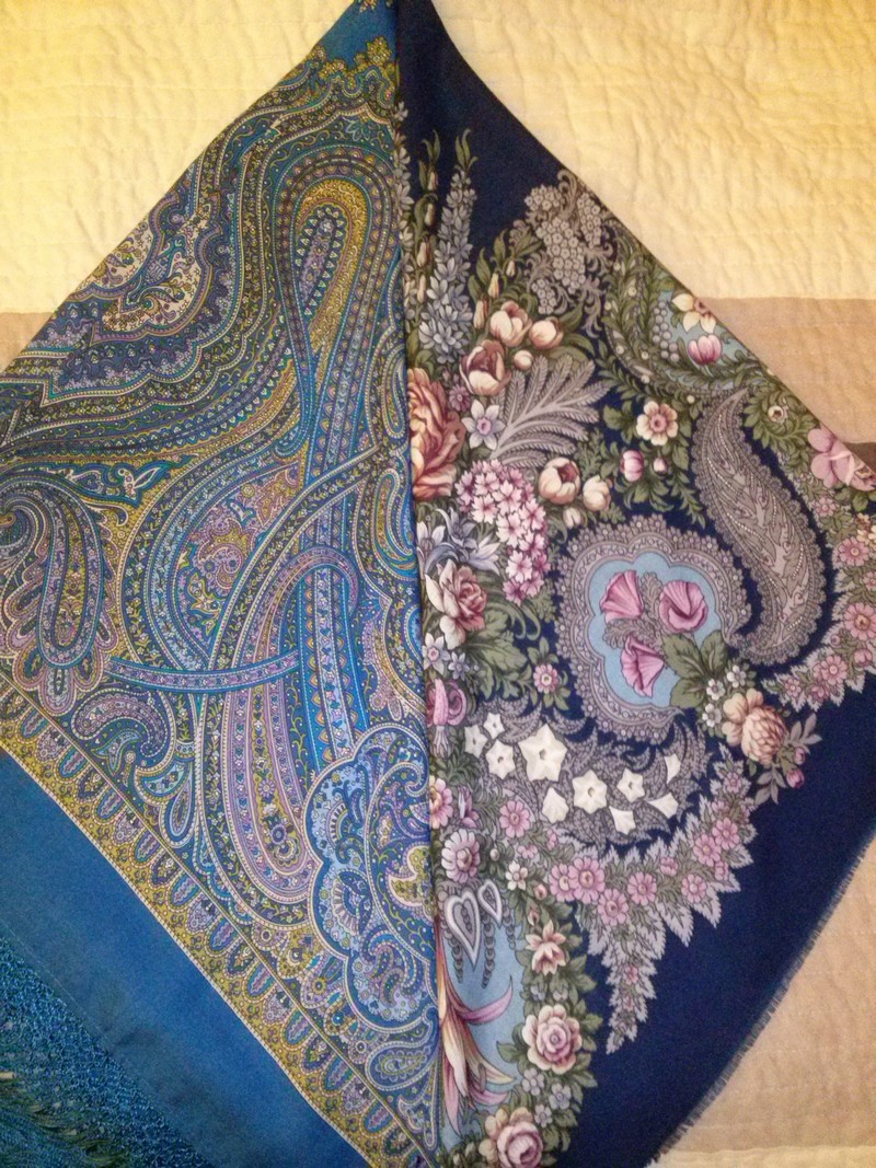 НСВ-15 и ТВ-12. Снимала со вспышкой, цвета почти как в реальности (на моем экране); у НСВ кайма не чисто синяя, а уходит в темную бирюзу. Напишите, что именно вас интересует, завтра могу поснимать при дневном свете.Regata писал(а): Может ли кто-нибудь сравнить Над серебряной водой-15, Русские сезоны-14 и Таинственный вечер-12 или какие-нибудь два из этих платков?