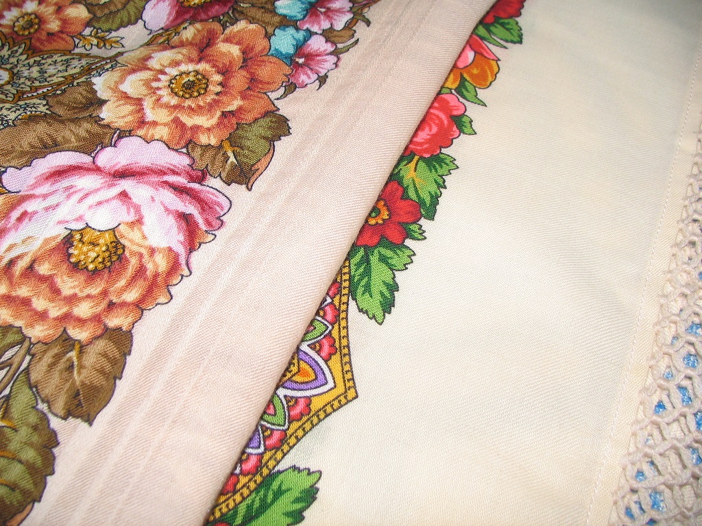 Я держала в руках 3 варианта Любавы - кайма цвета светлого топленого молока, цвета топленого молока уходящего в розовый и грязно-серо-бежевый с такой же бахромой. На всех фото Любава - вариант 1. Причем у Именинницы цвет каймы - топленое молоко ( чуть темнее чем у Любавы).