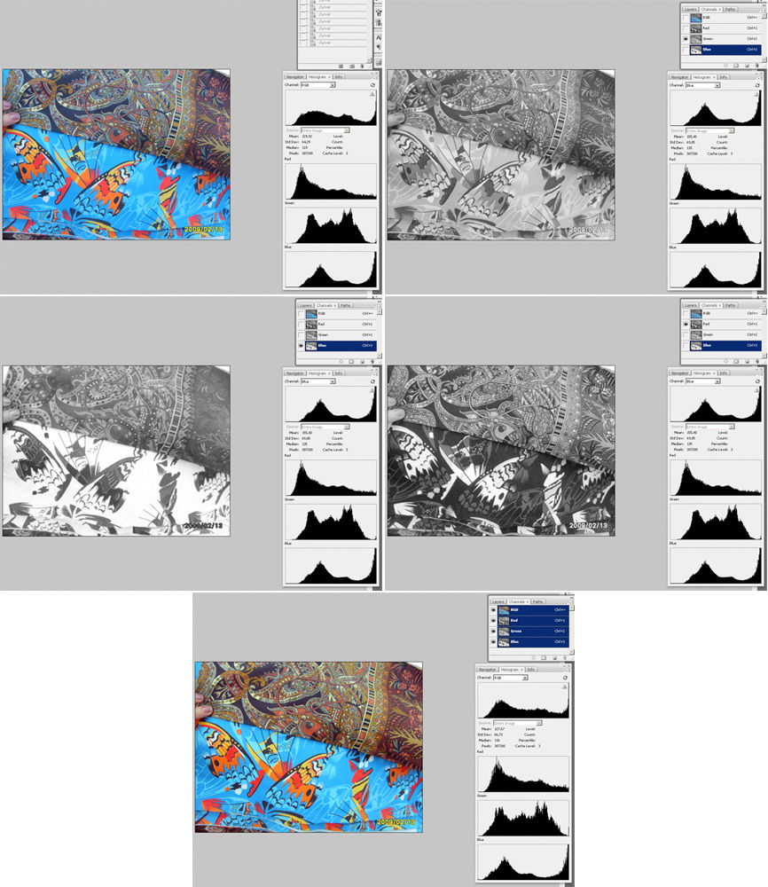 Т.е., если этот гистограмный верблюд, например, трехгорбый, то он должен быть таковым во всех трех (четырех) своих ипостасях? Но ведь реальный кадр очень редко имеет такое правильное распределение цветов. А уж платок - тем более! Вот и гистораммы фото "Золото Исиды + ткань" о том же говорят.