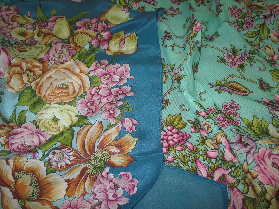 Бирюзовые "Цветы для любимой" - очень нежный колорит "живьем", в драпировке на первый план выходят цветы сиренево-розовые и бежевые, кайма морской волны, выглядит очень спокойно и благородно. Крепдешин и печать рисунка великолепного качества ( на тех, что я видела вчера в Москве, в Ветошном), платки аккуратно подшиты. На бежевом -1ом -колорите, кстати, тоже. Я бы советовала по возможности примерить, именно оттого, что в намотке цветы начинают солировать, общая гамма платка меняется от ожидаемой бирюзовой - в сиренево-бежевую. А 1595-1 - бежевый - платок многих примерявших девушек и дам бледнил. Но все равно, очень хорош! К весне