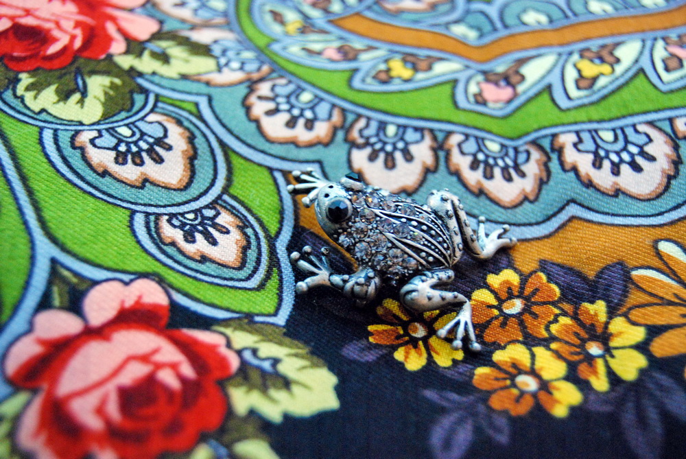 Подарили мне на Новый год брошь-лягушонку. Но так, как я не поклонница земноводных и др. животных на брошах (вообще-то,массивные кольца и серьги мне привычнее, с брошами я, пока, на Вы), то лягушка так и живет в подарочной упаковке. Вот, высвободила ее для фотосессии. Меня покорил рассказ о Мадлен Олбрайт и ее брошах, которые она одевала всегда со смыслом. Интересно, какой смысловой оттенок можно придать наряду, одев такую вот лягушку?