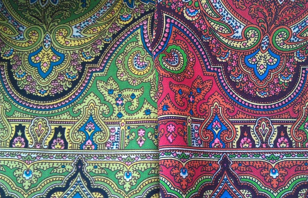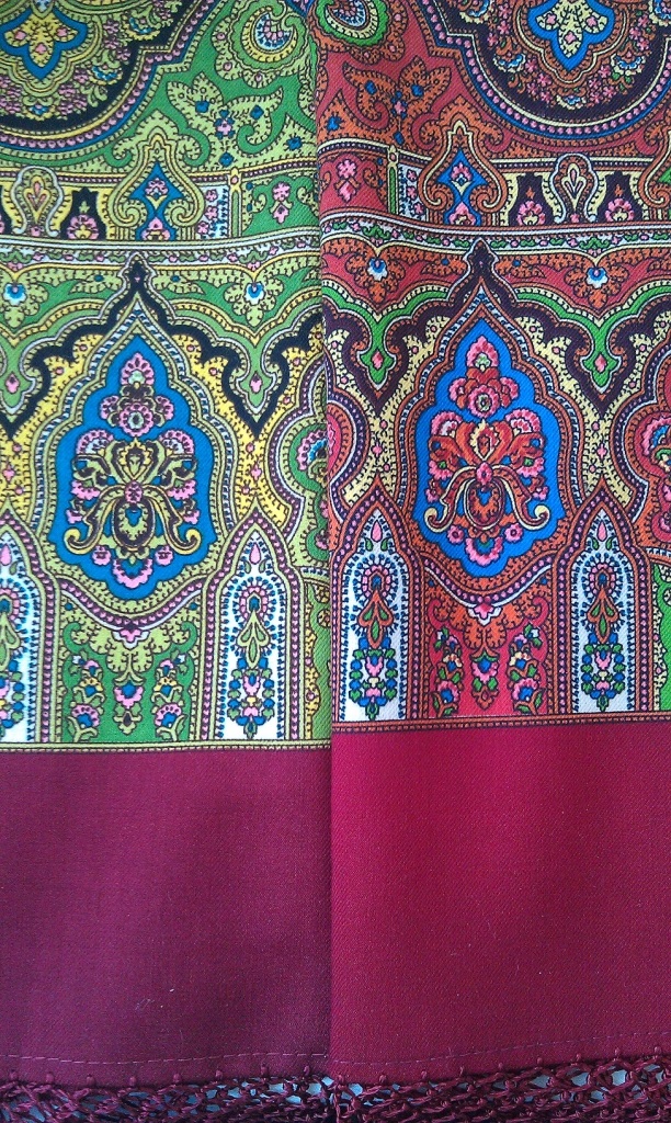 У меня зеленый Садко один из лидеров по повседневному камуфляжу (вместе с синим Февралем), настолько удобный, что кажется будто и нет его. Ношу с джинсами и рыжей курткой кожаной, когда большая шаль неудобна или неуместна (в поездках, например, с сумками-чемоданами шаль боюсь таскать, а вот платок - за милую душу). Поэзия Востока очень нравится, но носится нечасто. Мне нравится она вечером в свете фонарей или при искусственном освещении - зелень углубляется, становится бархатной, а золото начинает гореть как вышивка. Днем, на солнце, этот эффект теряется, становится платочек более скромным. Поэтому надеваю на вечер, на черное или темно-зеленой платье, на одно плечо углом (благо мой невеликий рост позволяет ему выглядеть шалью). Морозко у меня нет, наверное, и не будет - не люблю как-то этот платок, хотя лилии на ППП редкость. Край сандала тоже не мой вариант - слишком камуфляжный, на мне тряпочкой застиранной выглядит, а жаль, нравится.