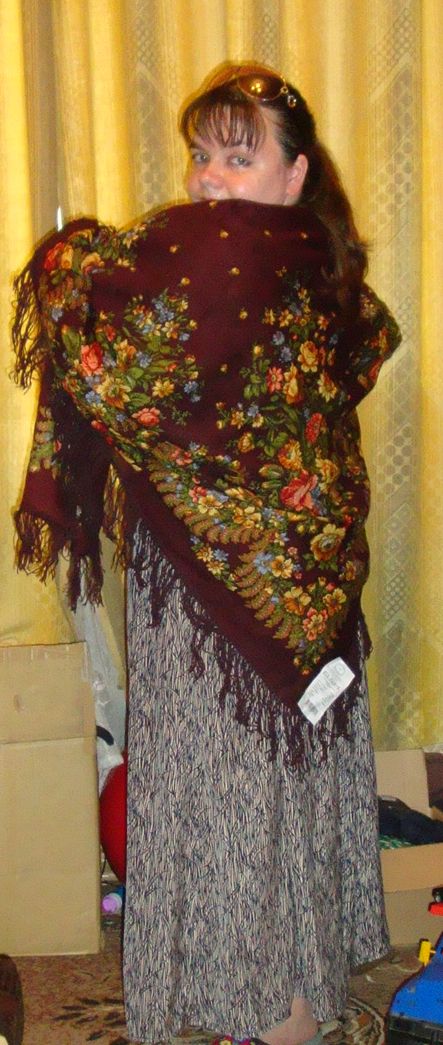 Получив сегодня Цветы России, так обрадовалась, что сразу решила их примерить. Фото в домашней обстановке, не обессудьте, что-то лишнее в кадр попадает, но главное - платок, чудесный, потрясающий и цвет, похоже мой!