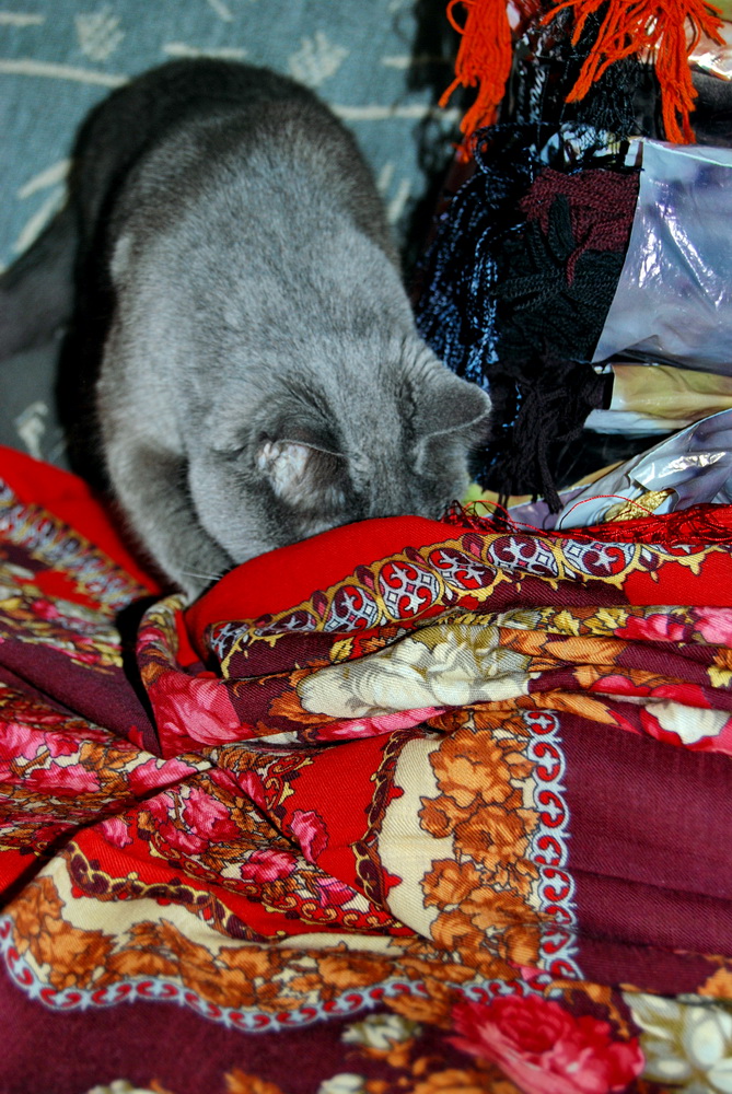 Сегодня занырнула в свои закрома, для поиска красной "Амалии"(хотела сделать фотосессию для темы про красный цвет), платок оказался на самом дне. Пока я занималась фотографированием, мой котик успел тщательно обследовать содержимое закромов