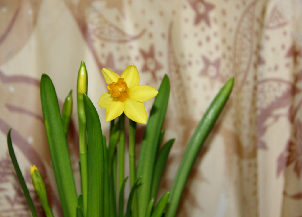 И весенний жёлтый цветочек в горшке, который купил дедушка для Ники, а Ника этот цветок поливает. Вчера появился первый нарцисс.