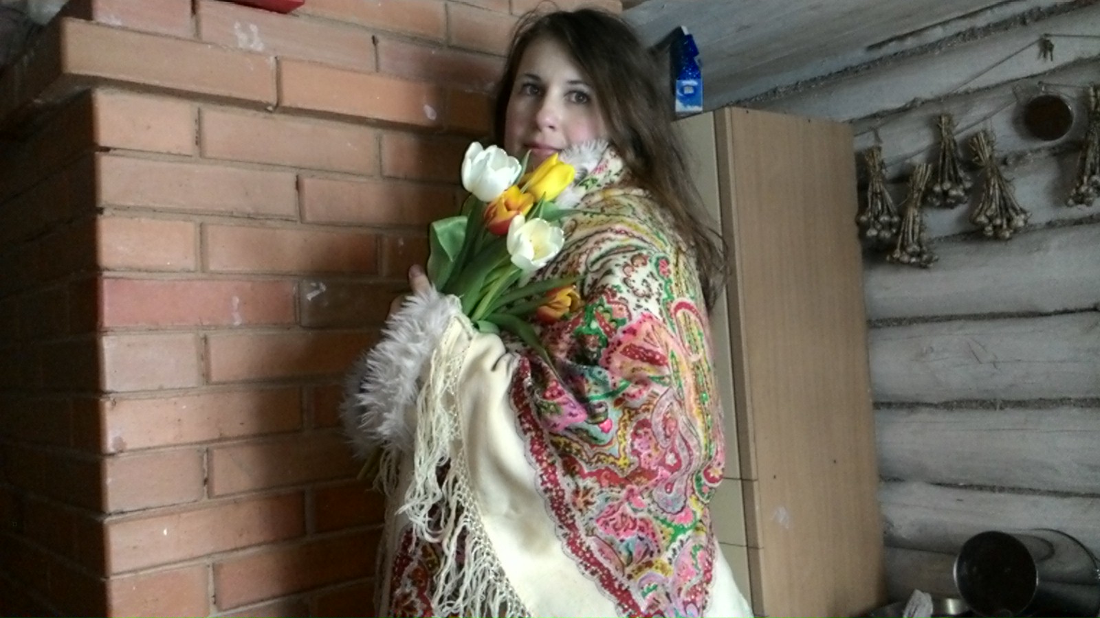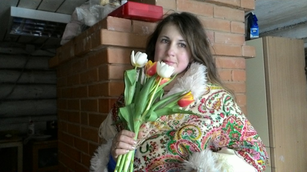 Потом грелись у печки и поздравляли свекровь,которую приехали проведать, тюльпанами.