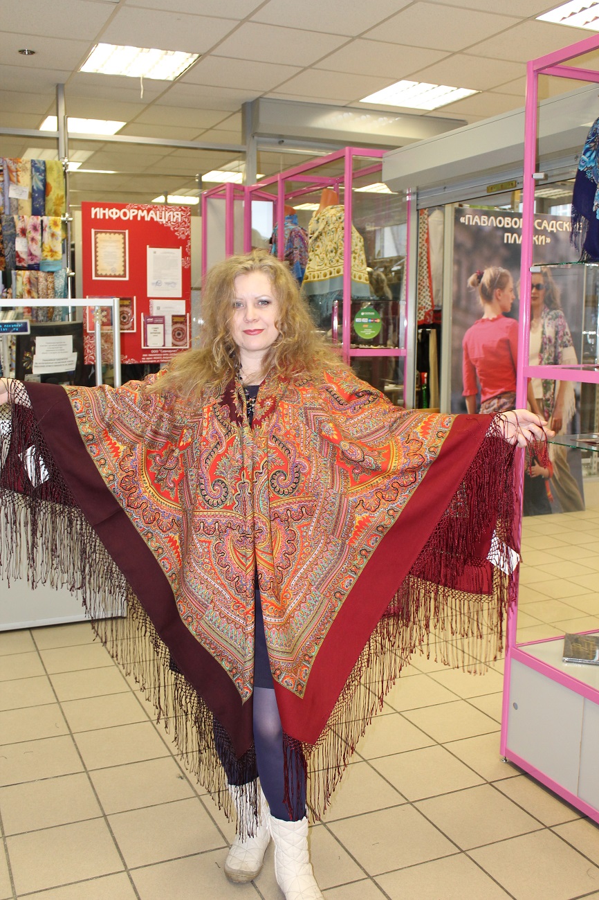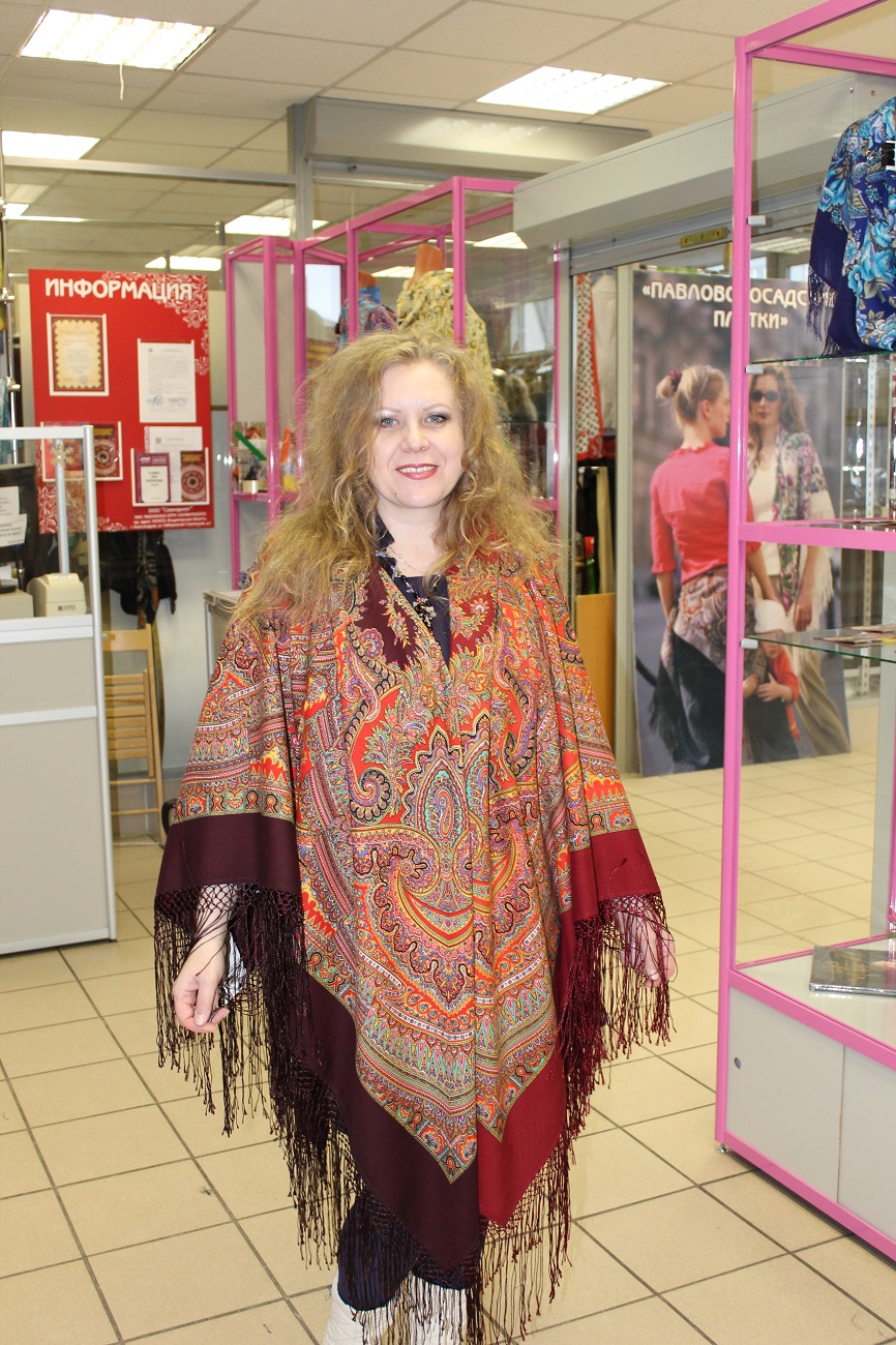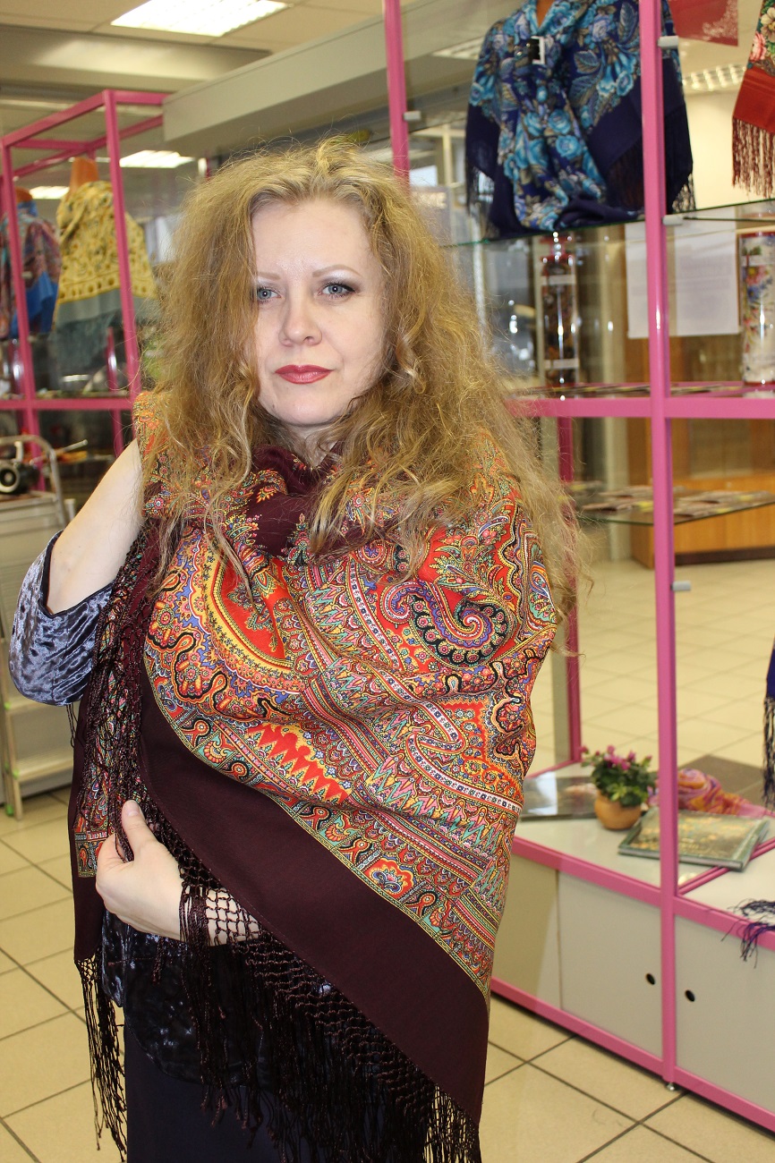 А теперь шаль, без которой я не смогла уйти. Причем сравнивали три имеющихся в наличии экземпляра, у одного кайма бордовая, сразу убрали, у второго кайма чуть светлее той, что я купила, но бахрома бордово-сиреневая, баклажанная. И моя, шоколадная, с шоколадной бахромой, Люся сказала, что это 17-й, а не 7-й колорит.