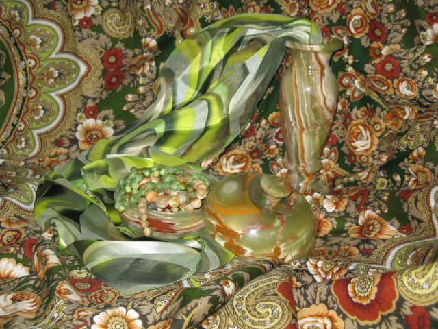 Селена, красивые платки! На первом фото я даже сначала не разглядела шикарную шкатулку, настолько цвета слились между собой! Она из малахита? На втором фото, наверное, оникс? Очень и очень красивые фотографии!