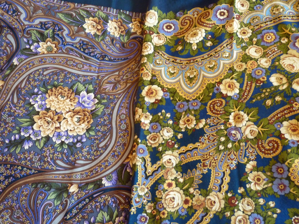 Сравно Карнавал-14 с его зеленым братом и Посадским-14. Как видно, светлые цветы на шалях почти одинакового цвета.