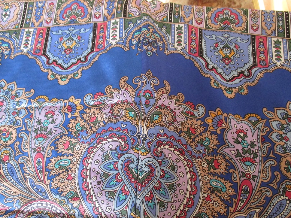 Сравнение колоритов шелкового платка Восточная сказка старого и нового разлива. Кайма нового бледнее, хотя сам рисунок чуть более ярче.