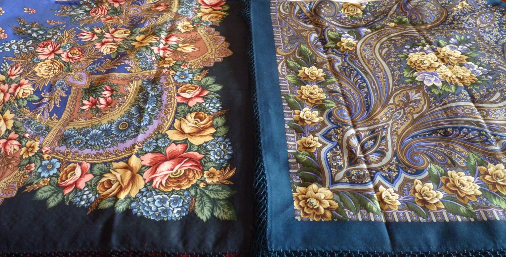 Сравнение колоритов шелкового платка Восточная сказка старого и нового разлива. Кайма нового бледнее, хотя сам рисунок чуть более ярче.