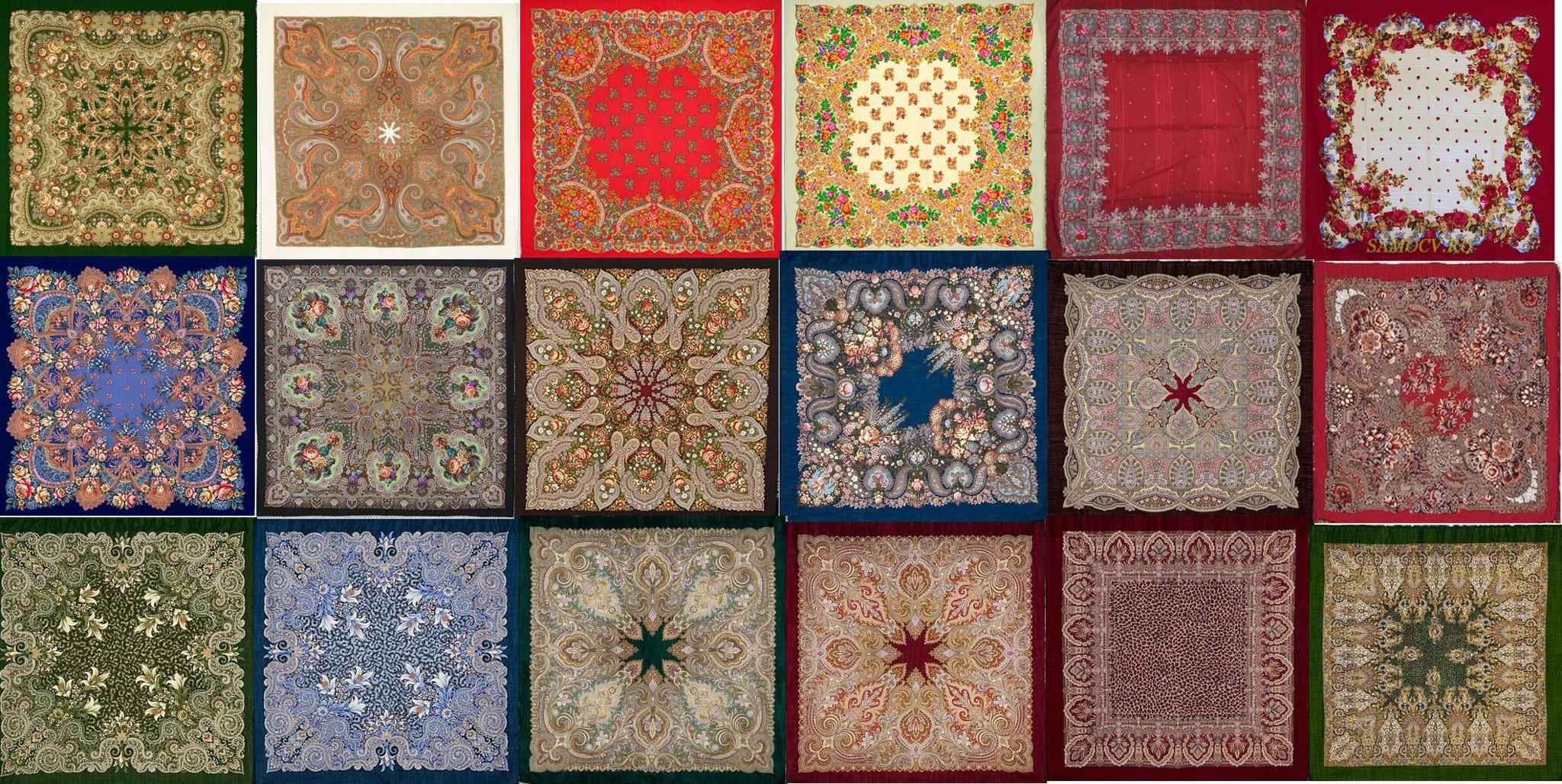 Для восстановления равновесия и справедливости выложу "склейку" собранных нами шалей и платочков по рисункам Татьяны Сухаревской. Их поболе будет, причём три рисунка представлены в двух колоритах. В первом ряду шерстяных изделий выложены восстановленные рисунки, далее идут авторские.