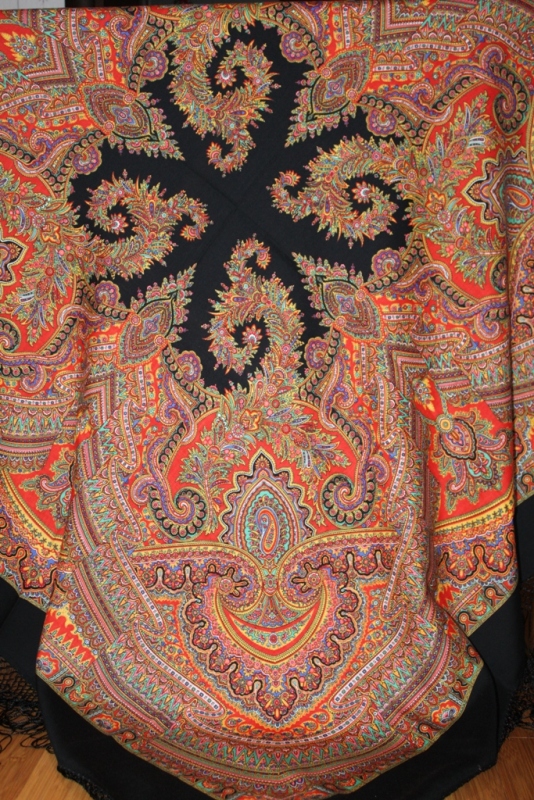 Евдокия чернопольная, платком. Размер 146х146 см, бахрома простая шерстяная. Привет из 90х, я так полагаю (ткань на ощупь и бахрома как у белопольных старинок того же периода).