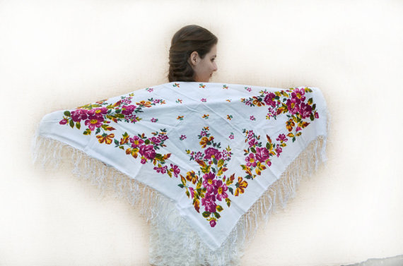 Платок 83х83 см. Продавец пишет, что платок шерстяной. Но, судя по виду и по кистям, платок хлопковый ( с вискозой?). Похоже на машинную печать.