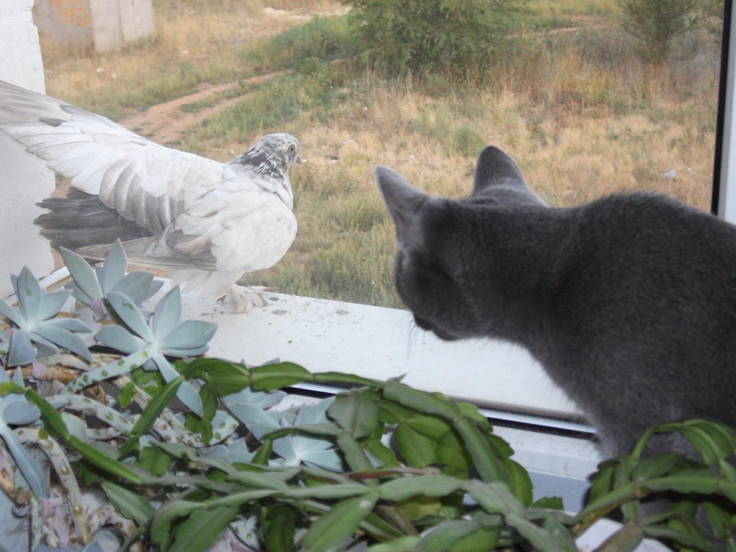 Прилетел к нам голубь на подоконник. Вроде бы - обычное дело. Но не для всех. Бедная наша Киса, вся извелась.. То с одной стороны подойдет, то с другой.