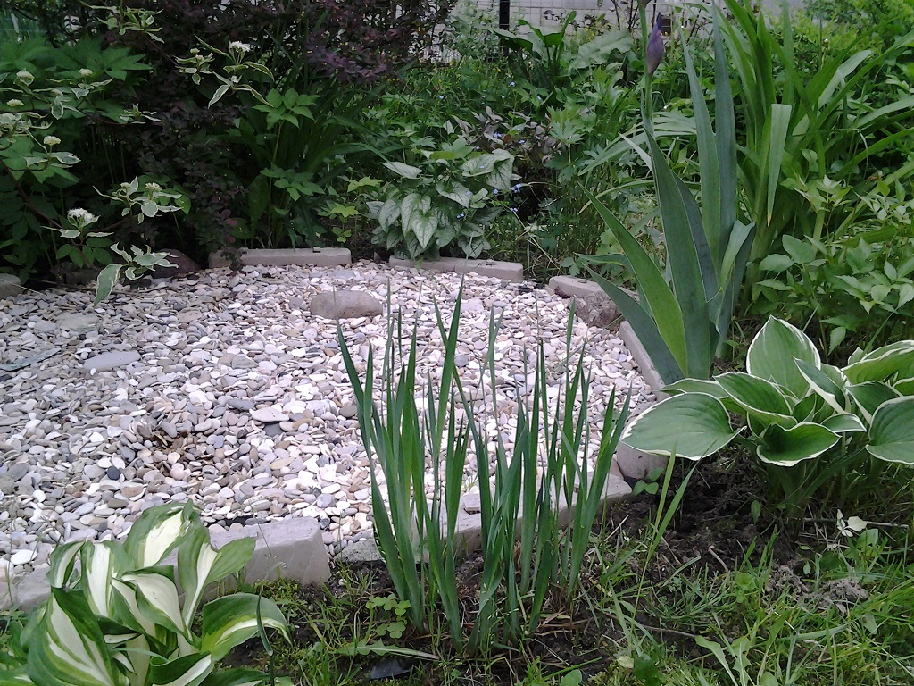 Это уже 2012 год, вокруг посажены Купальница, Астильбы, хосты, аквилегия, ирисы, маргаритки.