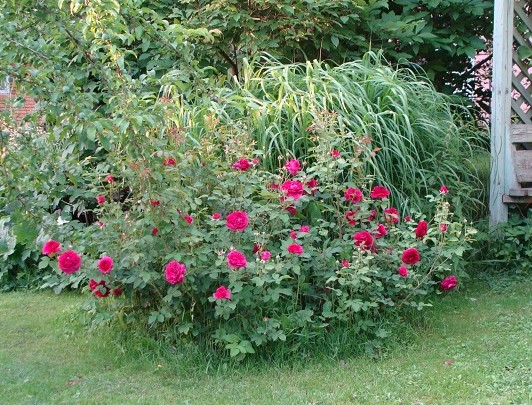 Но что интересно, у соседей у крыльца растет большой куст роз около метра ростом. Цветет почти круглое лето бордово-вишневыми розами, не обрезают на зиму, не укрывают. Это не шиповник и не что-то старое, кусту года 4-5. Вот только не помнят они, что это за роза, купили-посадили и все.