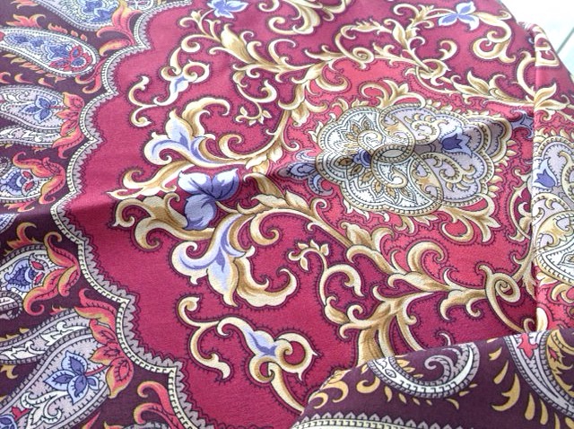 1. в разных магазинах встречается разное качество ткани. В нормальном случае - это мягкий, струящийся шелк, очень приятный на ощупь, в другом магазине видела оставшиеся три шарфа, где ткань была жесткой, как будто пропитанной чем-то (продавцы говорят, что к ним привезли такую всю партию);