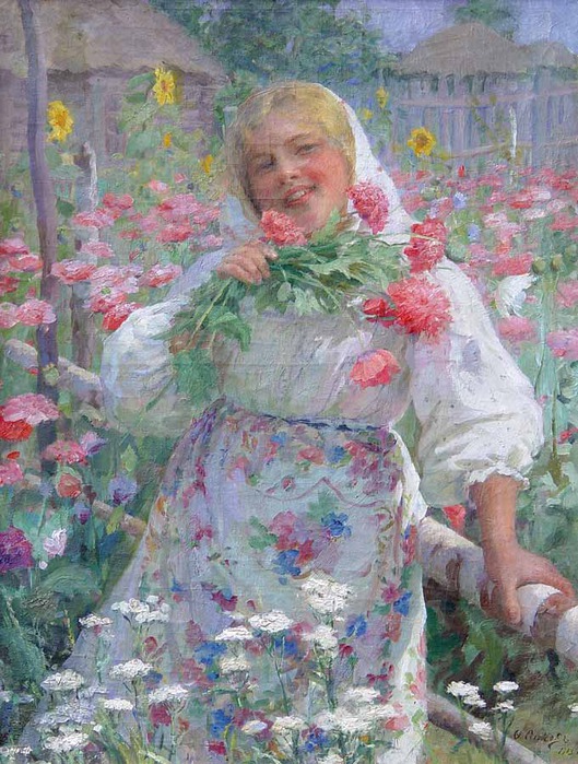 Мне понравилась по колориту картина В ЦВЕТУЩЕМ ОГОРОДЕ, очень приятная для глаз.