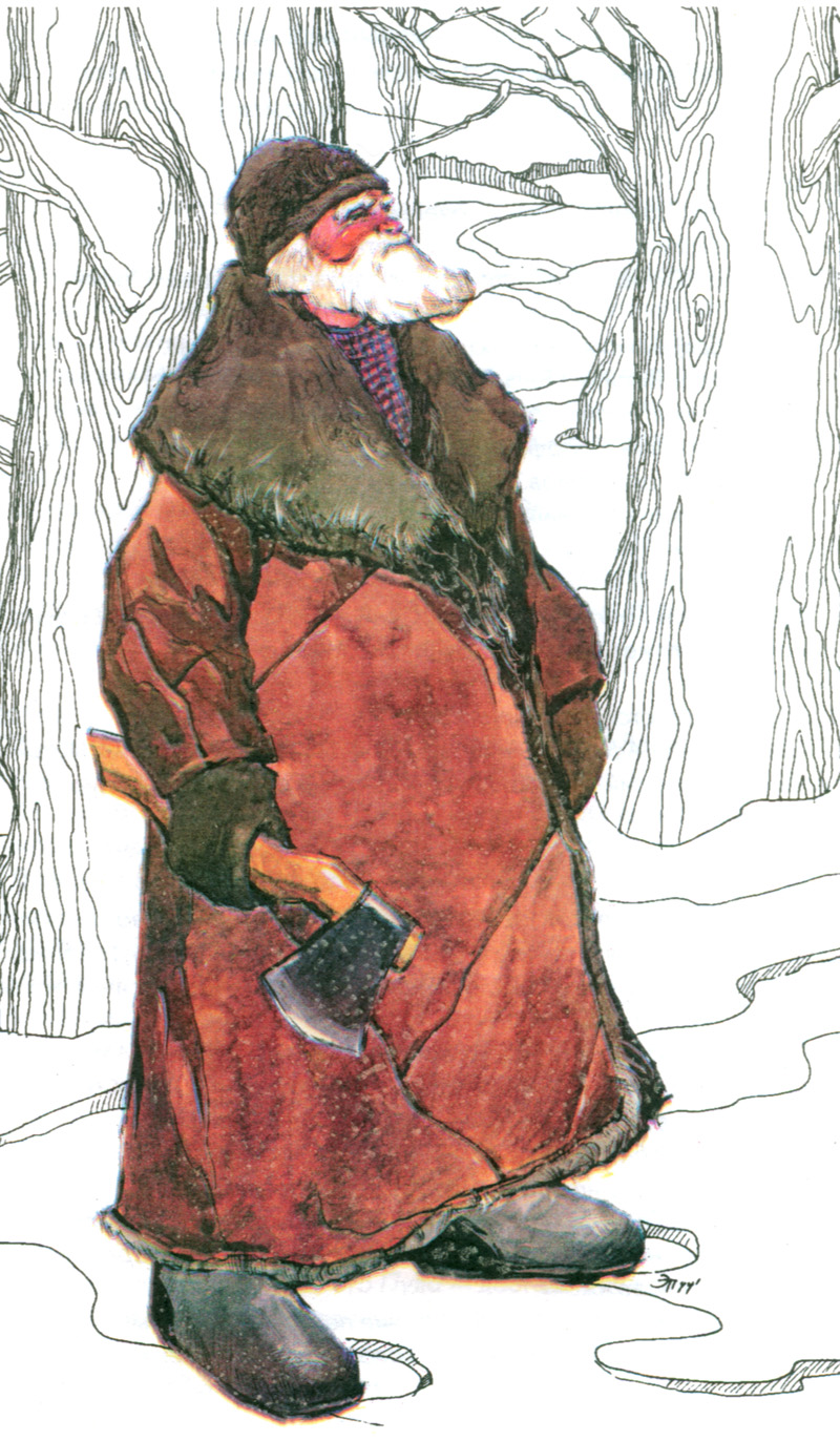 Старик-крестьянин отправился в лес на заготовку леса. В декабре это важное в хозяйстве дело изладить в самую пору. Земля промерзла, нет ни болот, ни топей. Непролазные дороги стали легки и доступны, заведут в любое место, где прежде только зверь лесной рыскал. От мороза завернулся старик в нагольный тулуп. Это большая и очень теплая шуба, сшитая из овчины. Нагольным прозывают его за то, что можно прямо на голое тело надевать, все равно мороз не страшен. Действительно из-под тулупа у старика виднеется одна пестрядинная рубаха. Рукавицы тоже для самых холодов предназначены. Называются они в том же духе «шубенки» или «голицы». Круглая шапка с опушкой дедовского еще покроя хранит от холода голову и уши. Окладистая борода закрывает все остальное, кроме носа и щек. Их то и треплет мороз, доводя до полного покраснения. Старик глядит на окружающий лес, смекает. Большое дерево в хозяйстве для разных дел надобно. Ствол идет на строительство, вершинки-«хлысты» и сучья пригодятся на дрова, из соснового корневища можно прялку внучке изладить. Знает старик, что дерево, как человек, растет, долго и медленно. Рубить его надо по правилам, чтобы все в дело пошло без остатка.