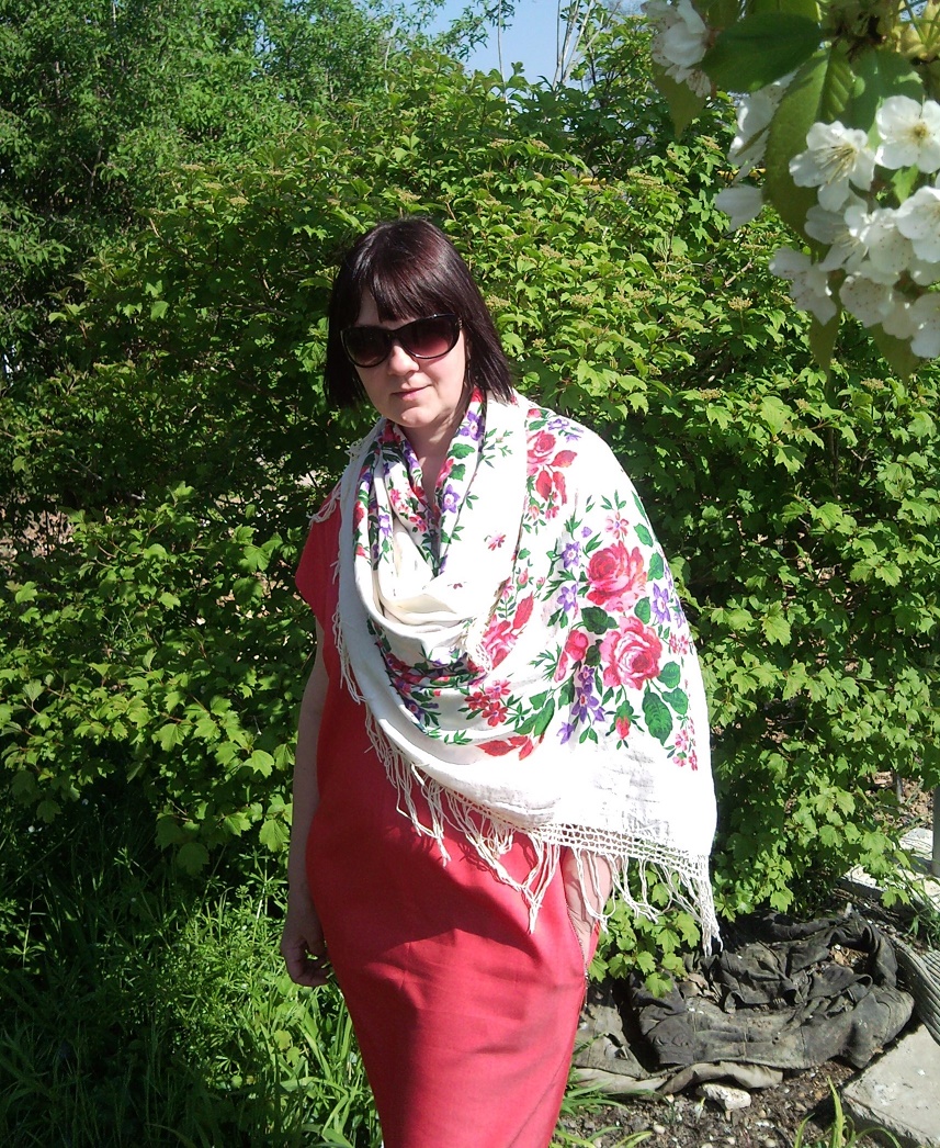 Сова Соня, ^% очень милый и нежный платочек, Вам идёт и с платьем хорошо сочетается. Вокруг такая яркая зелень и веточка цветущей вишни видна… Весна, красиво! ::