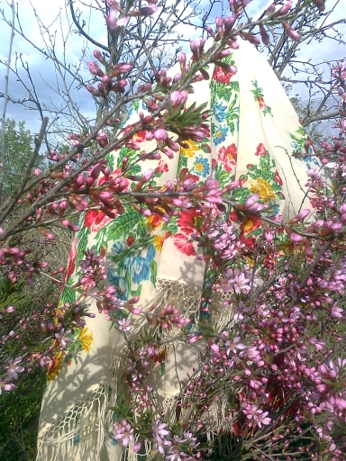 9 мая со мною в весеннем саду у мамы был платок Семена Петровича Рыжова. Белопольный платок с маками, один угол из "Четырех праздников".