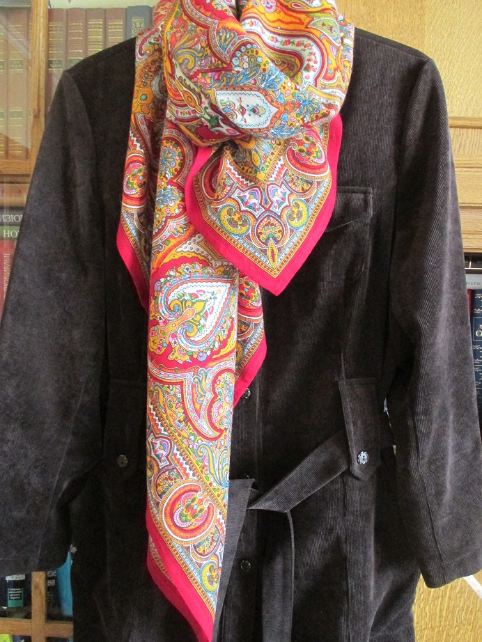 Добрый день!Вчера купила лоскуты!Ура!Наконец-то и я смогу подшить себе платочки.Начиталась на форуме про рулик,если честно,совершенно не представляю,как у меня получится.Пока подшила платок Купчиха московским швом(слава Богу,и раньше была с ним знакома),неплохо получилось,срезала коричневую кайму,очень темной мне показалась.Сегодня попробую обработать что-нибудь руликом :<>: