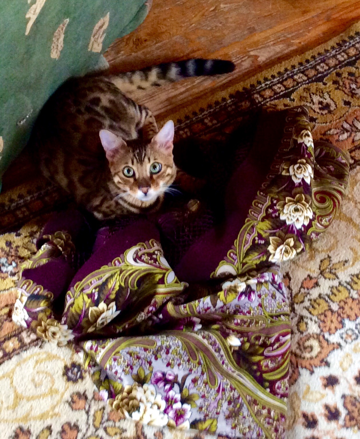 Тajga, это бенгальский мальчик. Шаль для любования невозможно повесить, тут же свалит и уляжется!