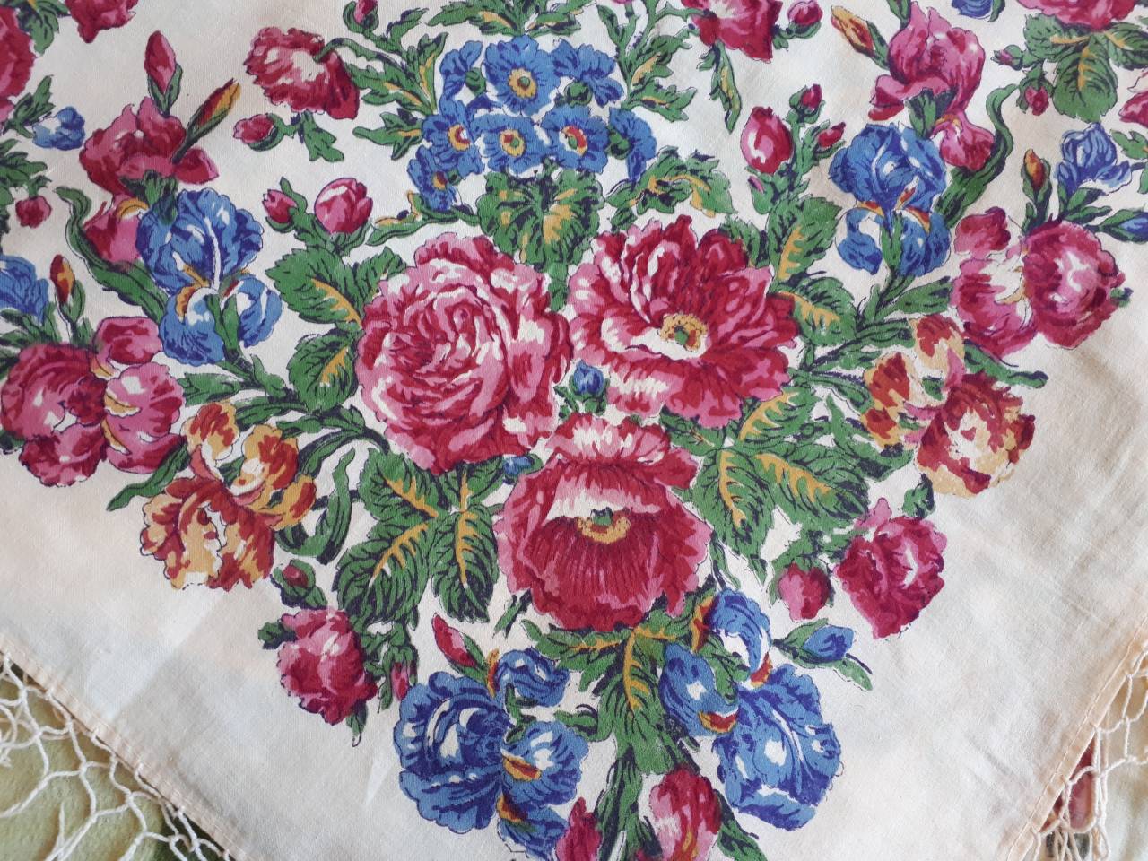 Так случилось, что именно сегодня в этот праздничный день я оплатила покупку хлопкового платка по одному из кроков Семёна Рыжова с ирисами. Вот такого
