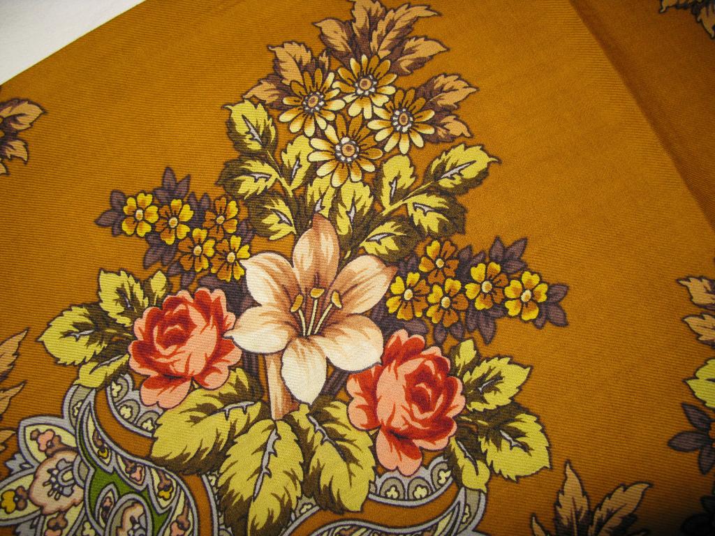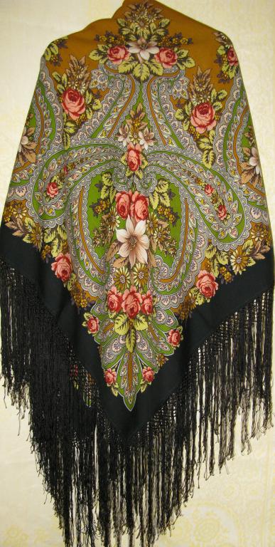 Шаль 148х148 на уплотненной ткани. Она печаталась в очень большом количестве колоритов. Этот - самый весенний. Правда, не мартовский, а скорее майский: нежная чуть желтоватая зелень молодой листвы на фоне темной хвои елей... А розочки... ну так это же грезы :P !