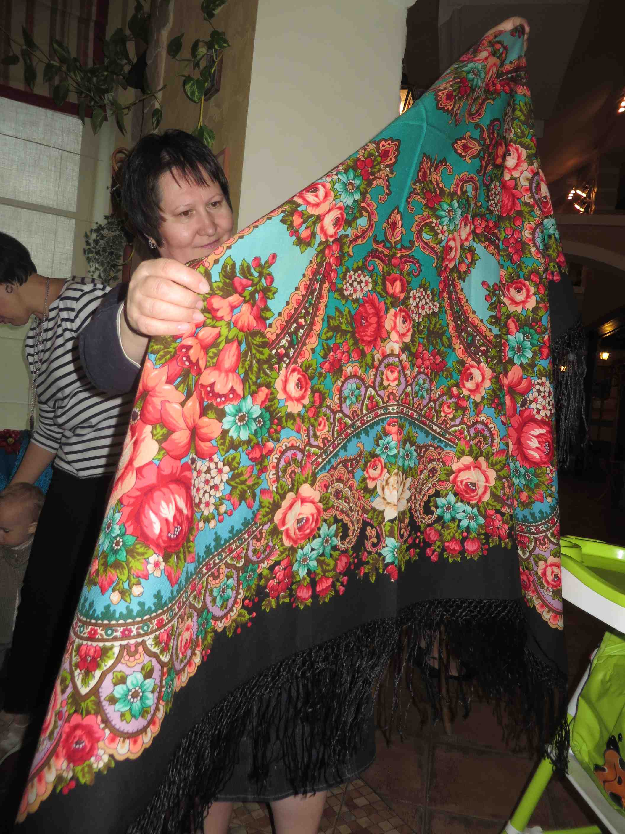 Вот тут мы с Машей демонстрируем Розы и пионы 11, но главное в этом показе - бахрома! Где тон в тон - это дело рук Елены (на мне), а которая светлее поля шали - выбор мануфактуры (на Маше).