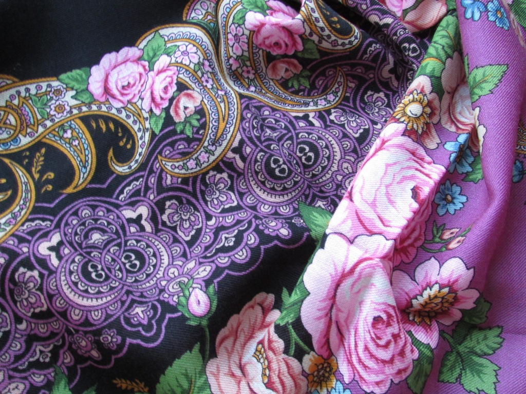 Marfa, какой красивый платок купили, притягательная гамма цветов-сиренево-розово-зелено -чернильные ... особенно понравились розы в орнаментальных элементах.Хотелось тоже бы такой .И название красивое.