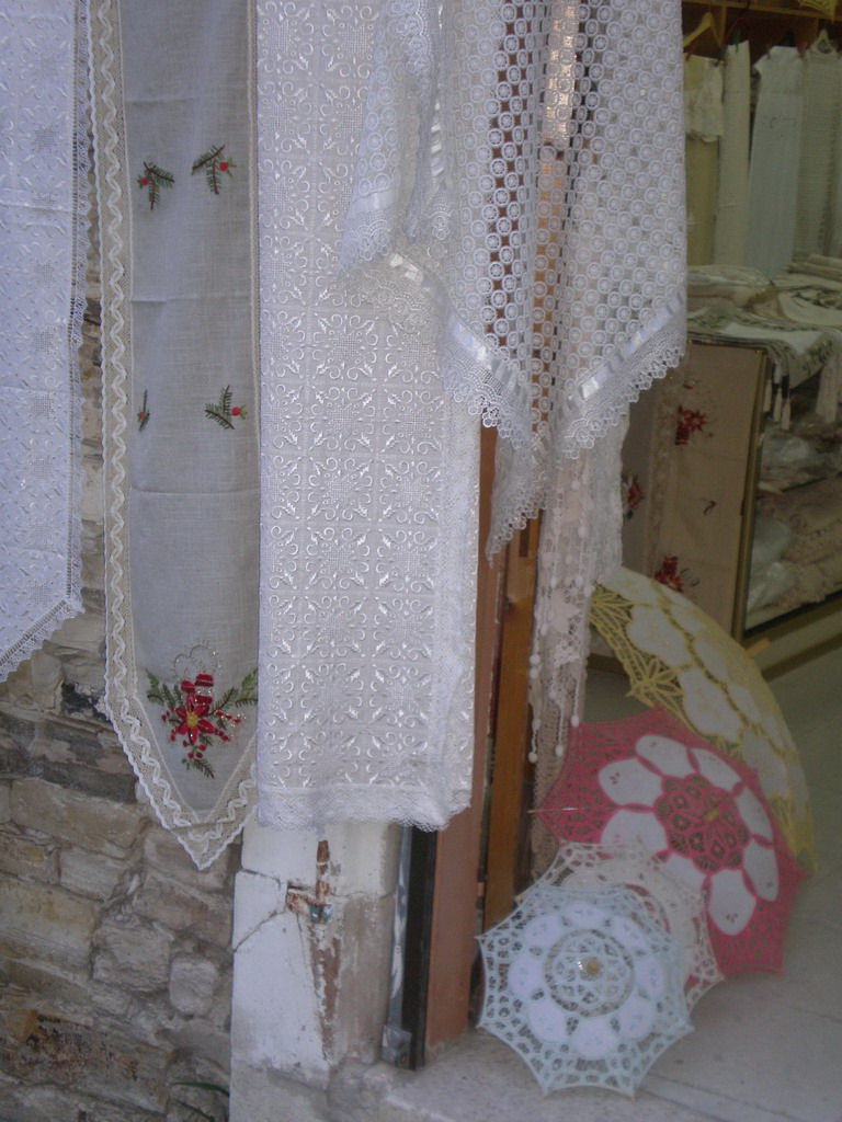 Софико , такие зонтики летом видела несколько раз на улице,они носят их защищаясь от солнца ,а мне кажется что такой зонтик и платья требует соответствующего и наверное шляпки. Алла,цены они не пишут на товарах.Я спросила пару раз кофточка(очень красивая) связанная крючком стоила 50 евро ,а салфеточка среднего размера связанная (сплетенная) на коклюшках 6 евро. Серебро очень понравилось, браслеты серьги ажурные очень красивые ,но муж торопил не дал сфотографировать . Надеюсь поехать туда с подругой ,тогда мы уже сфотографируем все что понравится.
