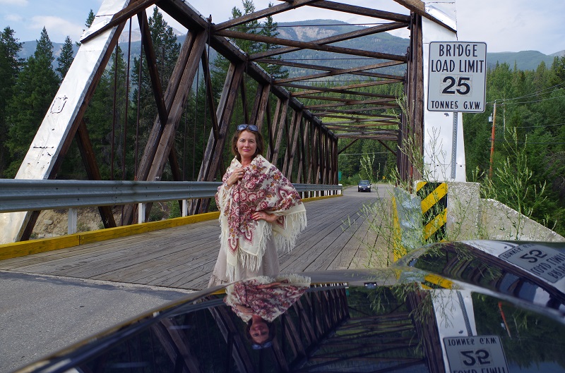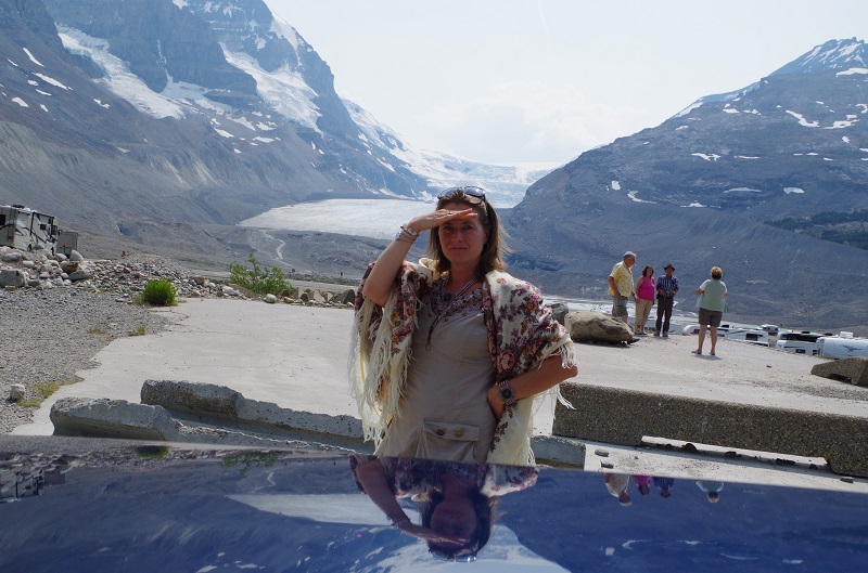 Была долгая дорога, 9 часов в машине. На улице жара 28 градусов. Но кодиционер в машине - делает свое черное дело, поэтому платок просто необходим. Проезжаю Лосиное озеро. Джаспер в огне. Смог окутал даже соседнюю провинцию. Озеро в сизой дымке На фоне ледника АйсФилд