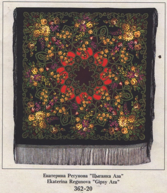 Попробую обобщить информацию о прекрасной шали "Цыганка Аза" авторства Екатерины Регуновой. Шаль есть в каталогах, начиная с каталога 96-97гг. Возможно, она начала печататься раньше, но я об этом не знаю