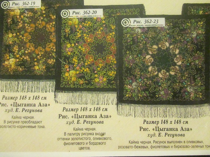 Добавлю фото копии каталога 2005 года ("Элитные шерстяные платки"). Думаю, полезны будут описанием колоритов.