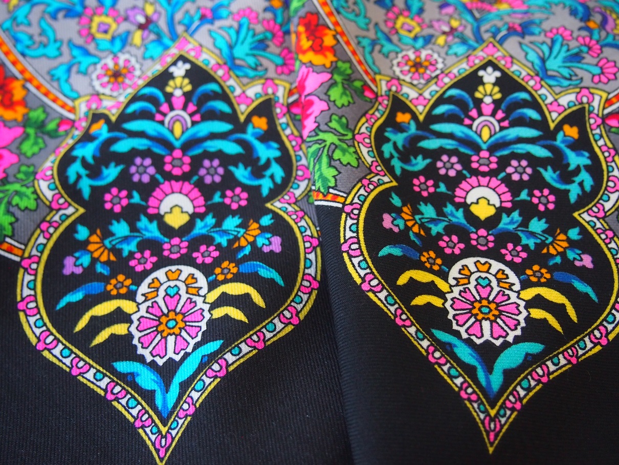 Черный цвет на старом выпуске гораздо глубже, бархатный. Бирюзовый цвет на новом ушел немного в неоновость, отличается сиреневый , на новом больше в сиреневый, на старом в розовый. Показалось что штампочки на середнике немного больше по размеру. ...измерила линейкой- действительно больше и медальончики на кайме. Я так думаю это наверно оттого , что шаль новая. Вытянута при покраске , при глажке.