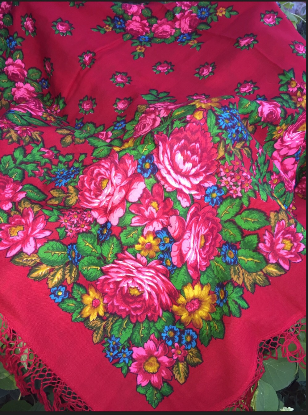 Не видела для себя возможным приобретение старых, кем-то ношенных платков. Но намедни таки не устояла. И теперь не нарадуюсь. Притащила и вам, хотя, конечно же, в базе фото этого платка предостаточно. Но он мне таким красивым видится. А какие розы! А какой красный цвет! Да и синий неплох :)