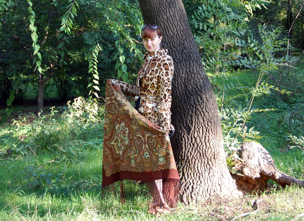 Как же мне понравилась Юлия 1230-17, когда ее показывала Далиборка! Это был феерически - такое совпадение по колориту и стилю с владелицей! ^% И как же я обрадовалась, когда в наш магазин ПП платков привезли такую же шаль! Вот тоже хочу показаться в ней. Надеюсь, что она мне идет хотя бы в половину так же как и Далиборке :) :lol: Конечно тандем с леопардовым пальто весьма спорен, но очень уж хочется носить шаль сейчас, не дожидаясь другой подходящей верхней одежды. :oops: