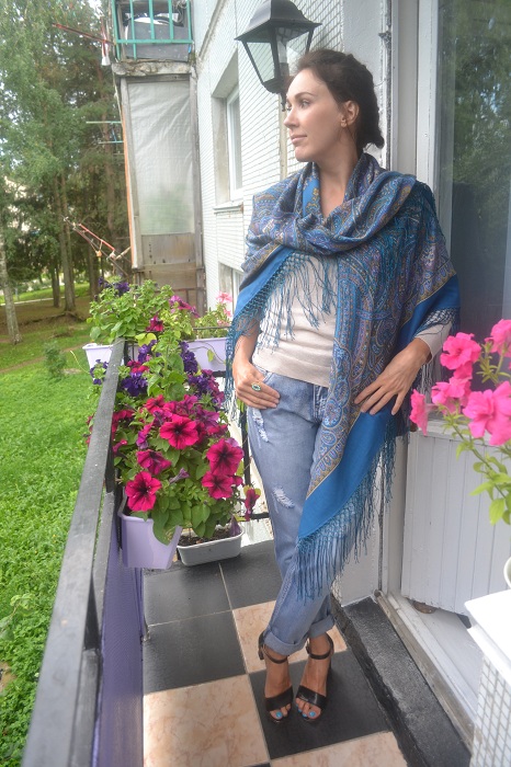 Очень понравилось несколько палантинов, сшитых из маленьких платков. Тоже стала думать в эту сторону. Труня, на Вас чудесный синий и очень понравились Цветущие Маки -18 особенно с красной блузой, ну просто очень очень!