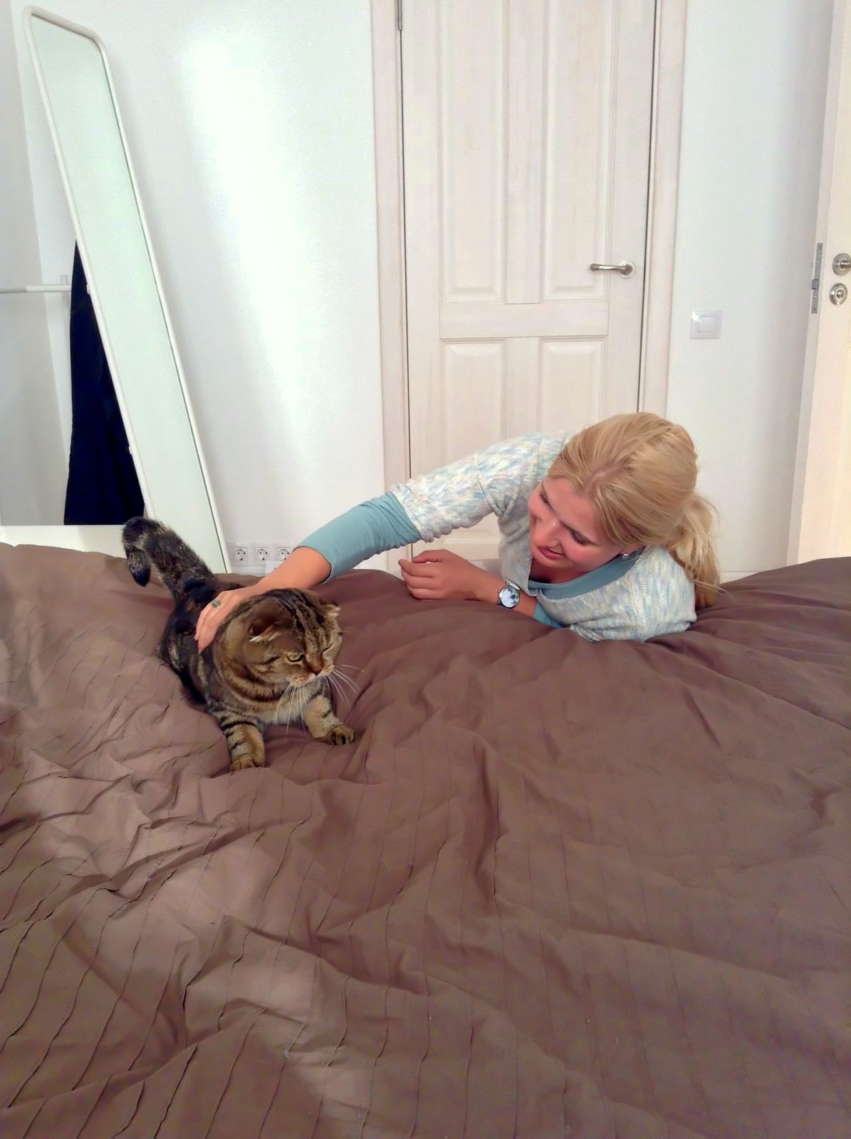 И по утрам сейчас, когда у меня будильник прозвенит, я его "заткну", но продолжаю лежать, она залезает прямо на меня и начинает "тарахтеть". Фиг проспишь с таким "будильником".