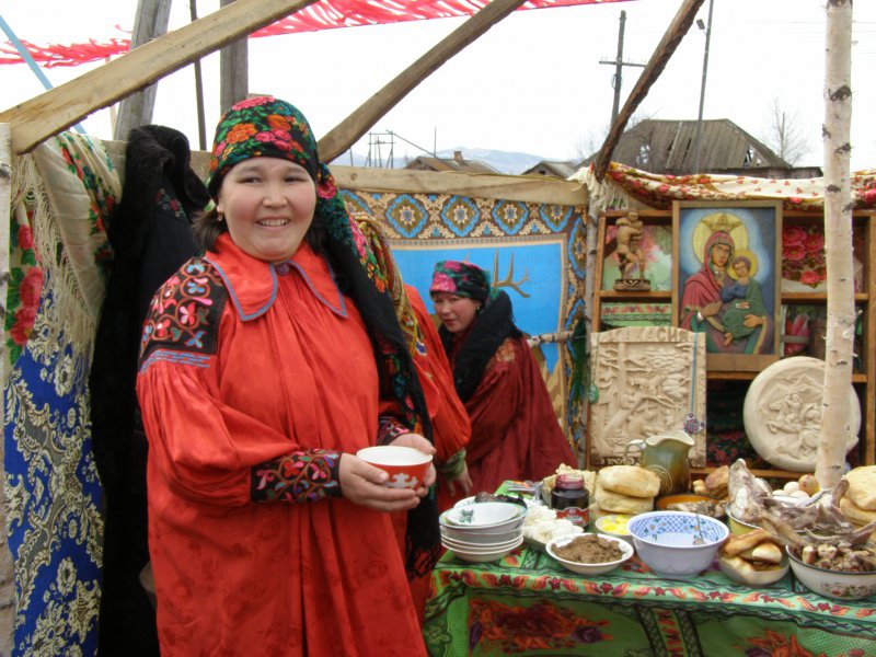 Это хакасские женщины в народном костюме. Как интересно у них держится на голове платок.