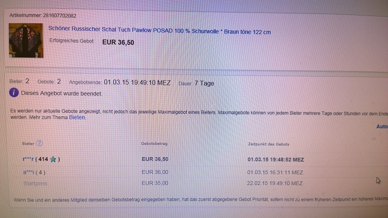 mrrmumur писал(а): Кстати, нашла у себя документы продажи Амазонки - я поставила на 50 центов больше изначальной цены аукциона, то есть Ваша версия - о людях, которые по Вашей просьбе не отходили от компьютера, но не могли бороться с толстым кошельком изверга, желающего перебить у Вас платок любой ценой, доказательно ложна. Счет сохранился, так что свои слова я могу доказать.