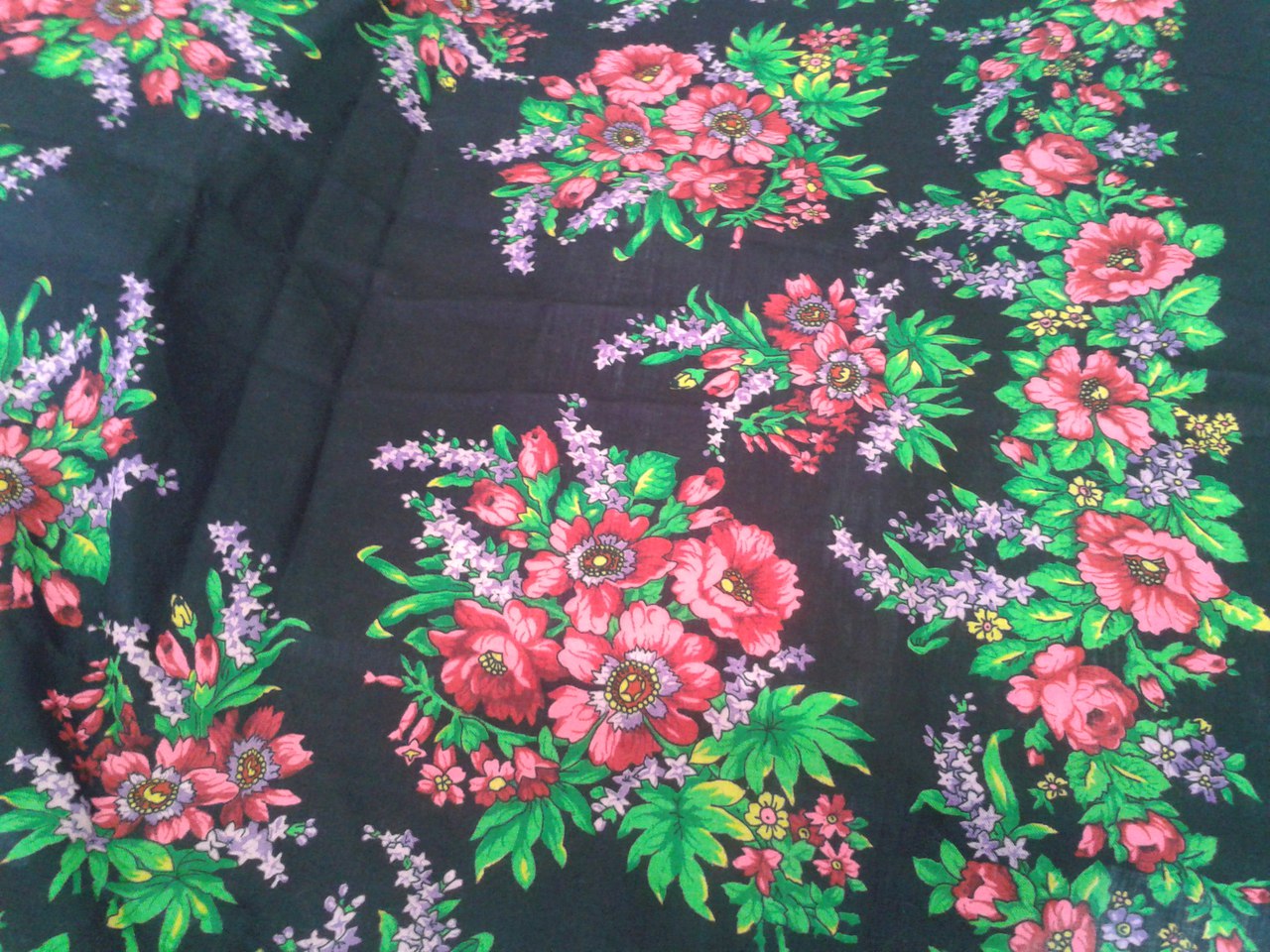 Такой красивый платок, с вишенками, виноградом (жаль, что стирали и бахрому убрали,сейчас у него размер 128х133см). Тааак похож на "Маков цвет" Г.Состковой, но не он...