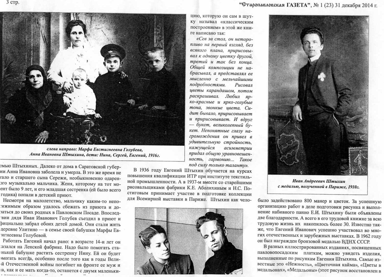 Попал в мои руки материал об Евгении Ивановиче Штыхине. Ксерокопия не очень хорошего качества статьи Т.А. Постиговой из "Старопавловской газеты", № 1(23) от 31 декабря 2014 г. Он настолько интересен, что размещаю сканы здесь. Если бы platki помог найти этот материал в виде хорошего скана газеты - была бы очень благодарна. Больше всего жаль, что пострадала фотография молоденькой Е.П. Регуновой, запечатленной рядом со Штыхиным. Но, что есть - то есть.