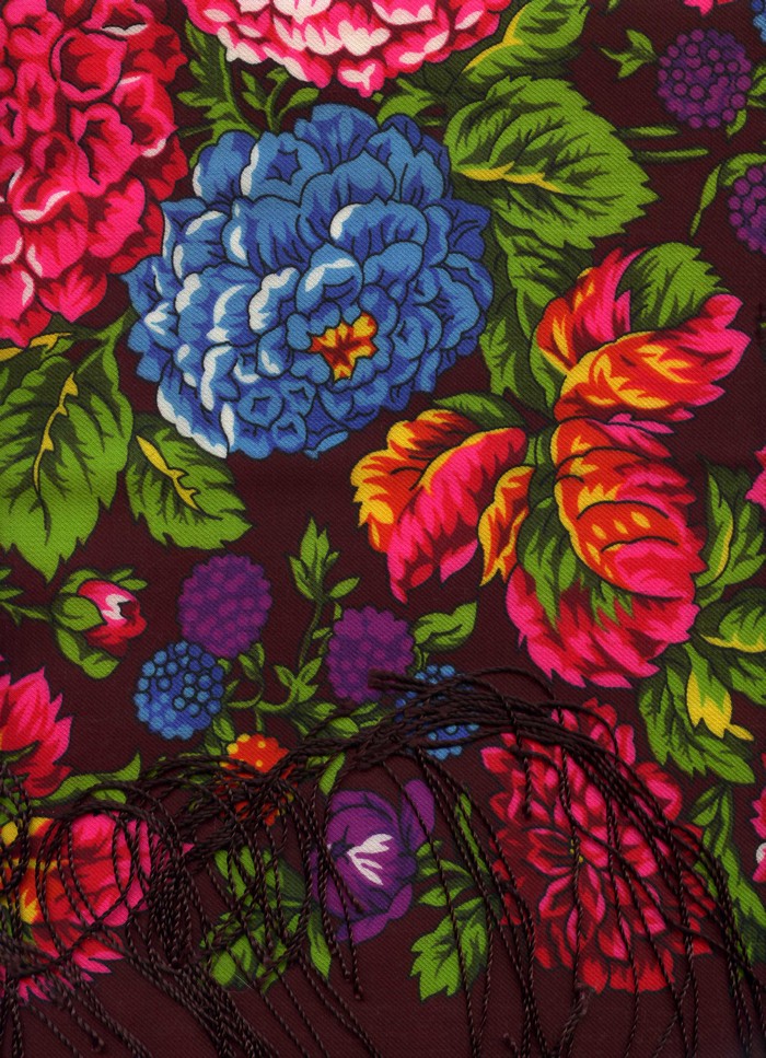 Тема ручной набойки на платках недавнего прошлого (скажем, на платках советского периода), очень интересная. Трудно ее начинать, она требует большой "насмотренности". У меня ее пока нет, но платки предположительно с ручной набойкой имеются. Возможно, для них нужна отдельная тема. Буду благодарна тому, кто ее создаст. А пока - скан "Ежевики" на скорую руку. Думаю, что ручная набойка.